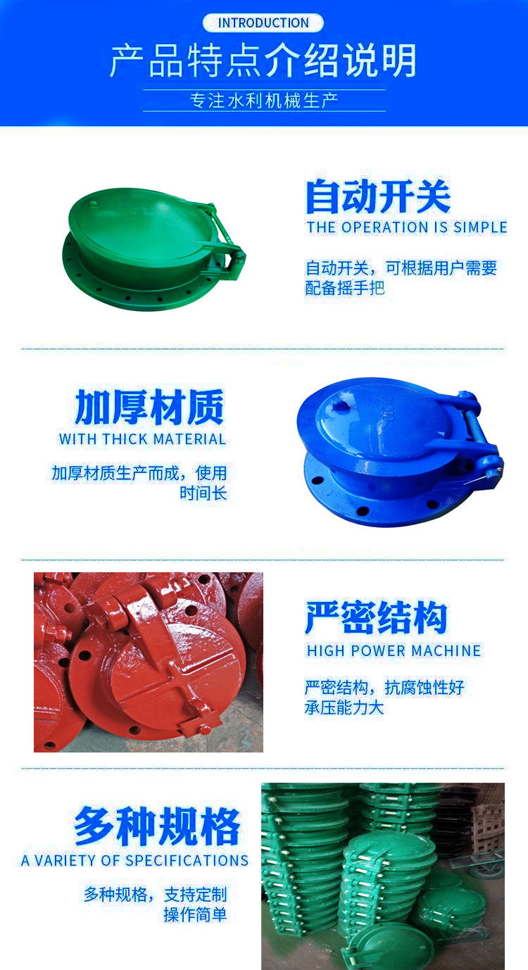 3.維護方便,使用壽命長。拍門主體材料QT500以上的球鐵,鉸軸為不銹鋼材料,軸套以銅合金為基體的球鉸式自潤滑軸承,雙重密封(碳鋼+耐磨橡膠),配合偶件不會銹蝕,可以使用30年以上。
